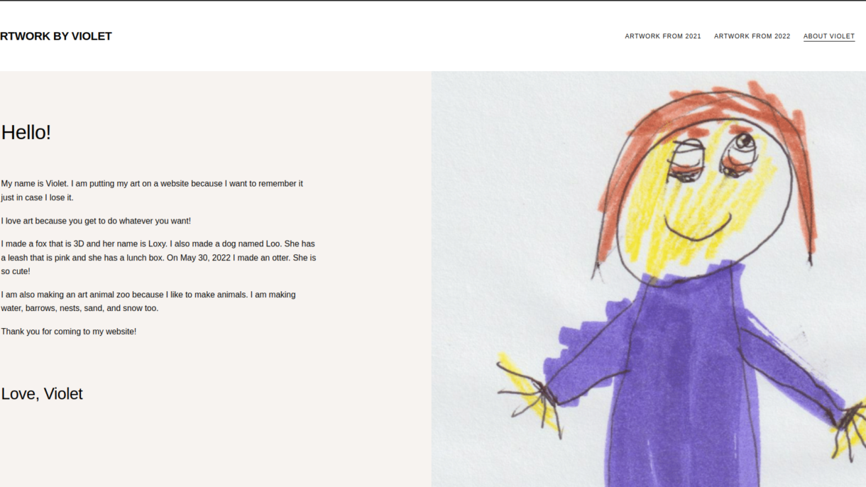 Artwork by Violet is a website dedicated to the art created by my daughter, Violet. We love to showcase her art and we found that the perfect method to do so is to create a website for her.